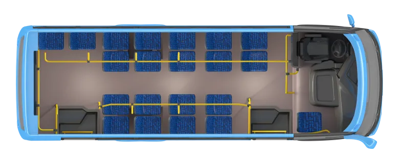 Широкая двустворчатая дверь 900-1200 мм с электропневматическим приводом обеспечивает быструю посадку и высадку пассажиров, что увеличивает скорость передвижения по маршруту